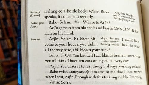 This central ruse is funny and original, and it’s interesting to see it move from confused conversations about technical details to a crime caper across Europe. I also really like the way the book deals with the language spoken by its characters. As you might expect, they speak English with Cockney-accented inflections, peppered with words and phrases in Turkish (or sometimes Turkish Cypriot, or Kurmanji). These words are included as the character has said them, but then in tiny letters alongside is the translation, and in the margin is the language. It’s a lovely way to accurately depict the argot, keep the reader informed, and remain typographically attractive.